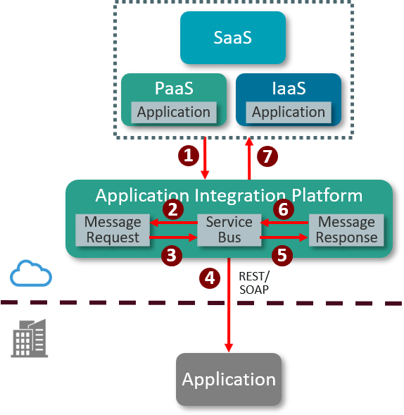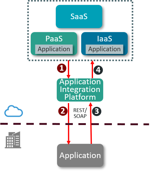 - The application integration platform communicates with the on-premises application. The on-premises application must expose an appropriate API (e.g. REST/SOAP) accessible from the public cloud.