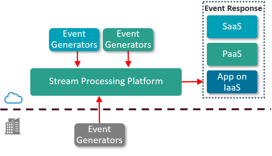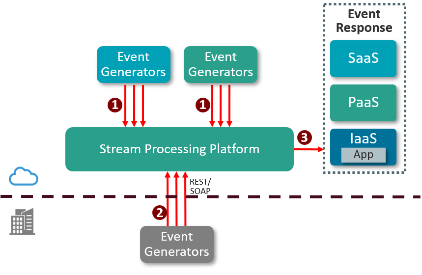 - The streaming processing platform filters, correlates, aggregates, and enhances the events and creates outgoing events which are sent are sent to SaaS, PaaS, or an application running on IaaS to be handled.