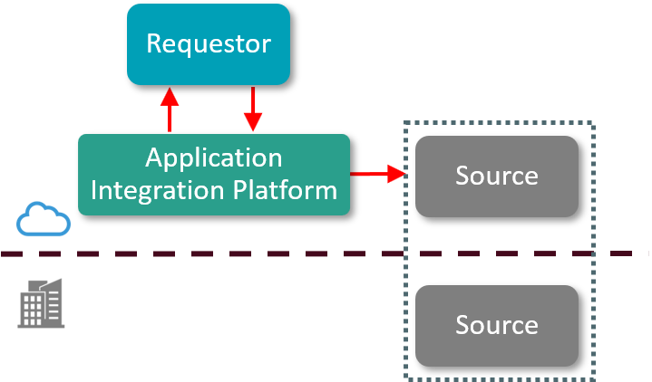 - The application integration platform communicates with the data source. This can be on-premise or in the cloud or both.