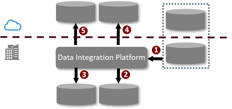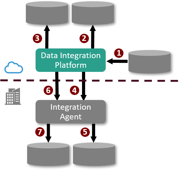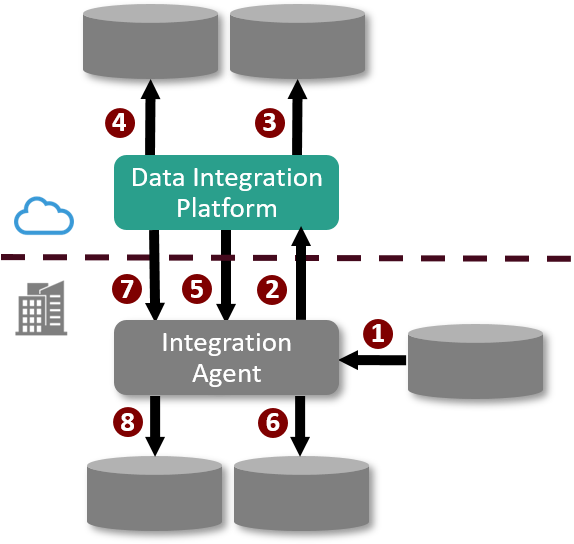 - The on-premises Data Integration Platform reads the source file. The source file may be on Cloud-based storage on on-premises storage.