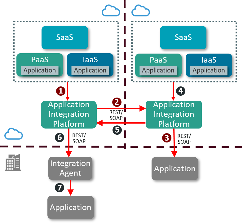 - The application integration platform communicates with application integration platform in another Cloud.