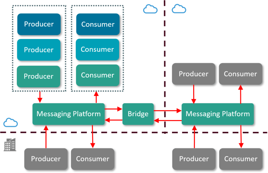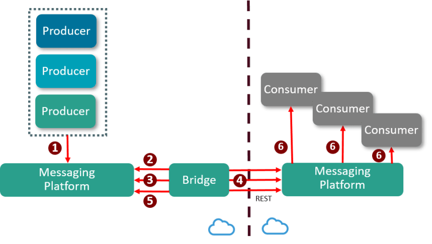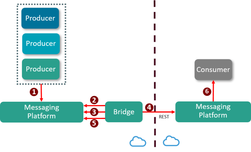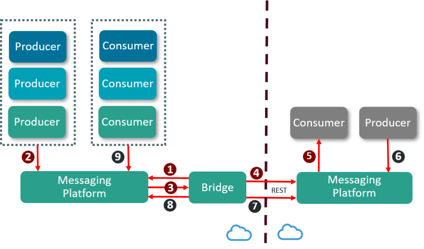 - The bridging software posts the messages to the Messaging Platform in the other Cloud.