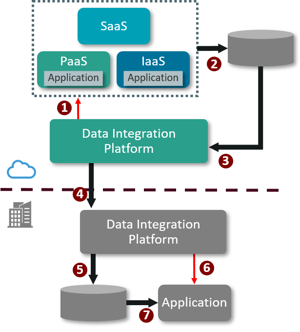 - The Data Integration Platform notifies the Cloud-based application to export a file. The Cloud-based application could be SaaS, or an application running on PaaS or IaaS. This notification could be time based or business event driven. The notification could also be replaced by a timed export from the Cloud-based application.