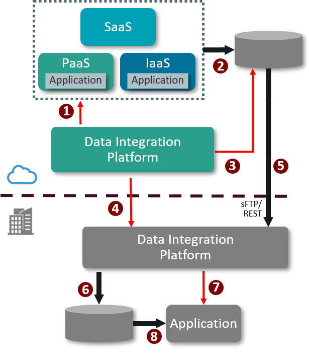 - The on-premises Data Integration Platform notifies the on-premises application that the file is ready for processing. The notification could also be replaced by a timed import or polling from the Cloud-based application.
