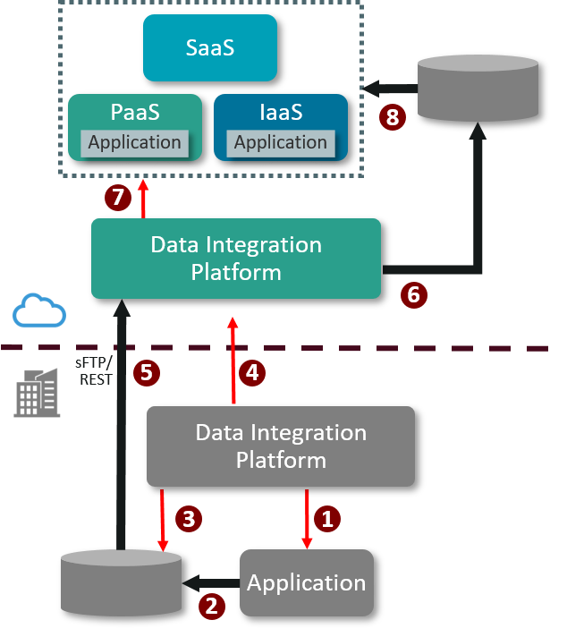 - The on-premises Data Integration Platform notifies the on-premises application to export a file. This notification could be time based or business event driven. The notification could also be replaced by a timed export from the Cloud-based application.