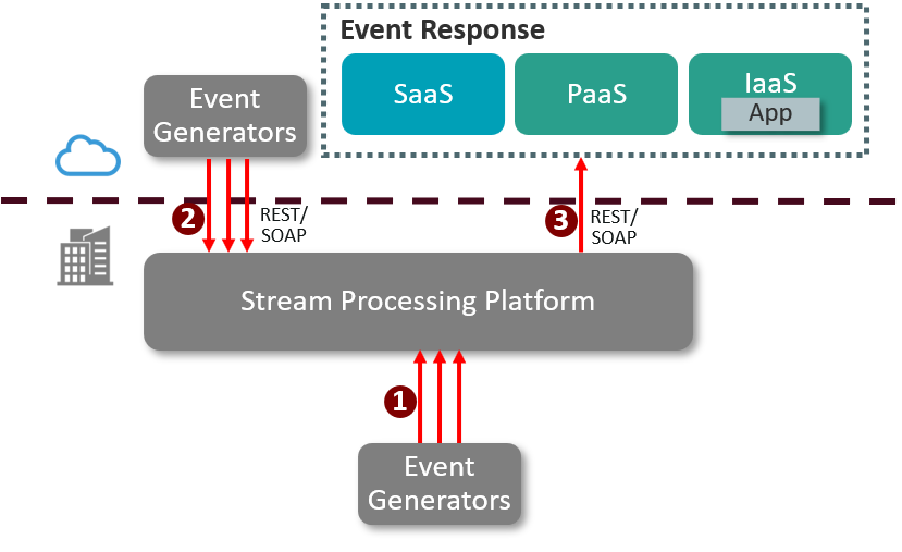 - The stream processing platform filters, correlates, aggregates, and enhances the events and creates outgoing events which are sent to the Cloud to be handled.