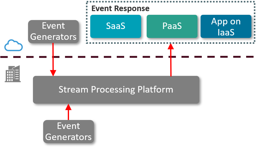 - The outbound event from the stream processing platform could be sent directly to a Cloud-based SaaS, however, sending the event to an application integration platform or messaging platform allows for a more flexible event response.