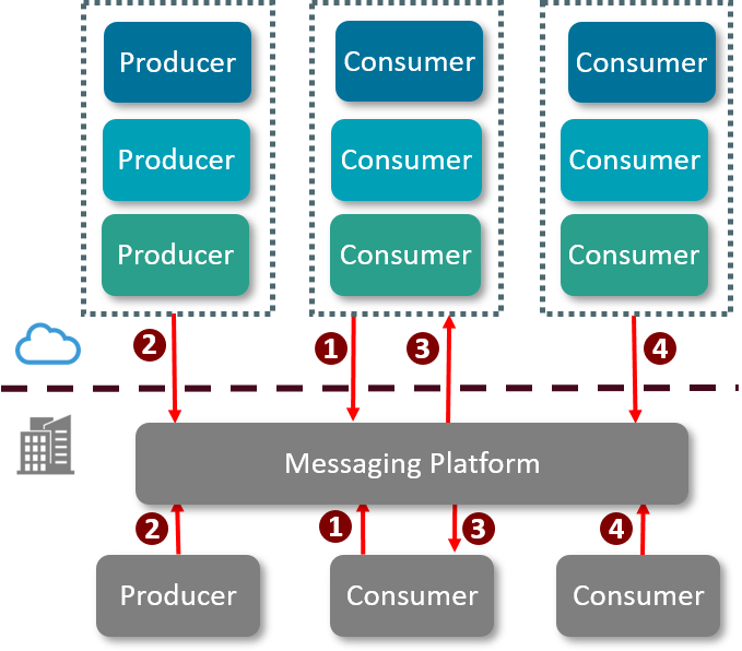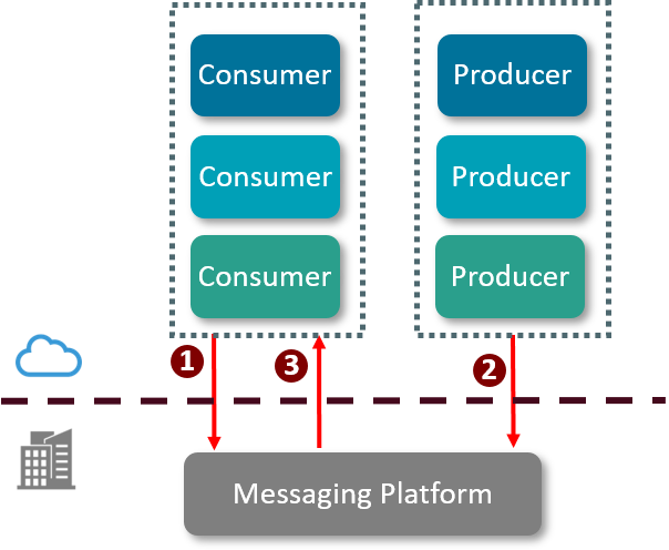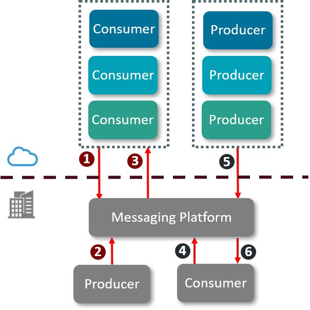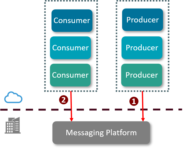 - The Cloud-based producer posts a message to the on-premises Messaging Platform. The producer may be SaaS, PaaS, or IaaS software.