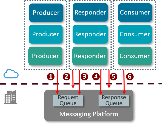 - The Cloud-based message responder commits the transaction with the on-premises Messaging Platform. At this point, the message in the Request Queue is removed and the message in the Response Queue is available for retrieval by message consumers.